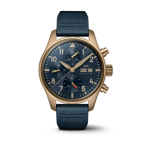 CASE: Bronze, Diameter 41MM; MOVEMENT: 69385 Calibre, Automatic, 46 Hour Power Reserve; DIAL: Blue with Luminescence; STRAP: Blue Textile Strap with EasX-CHANGE System; EXTRAS: Day and Date Display, Chronograph Function