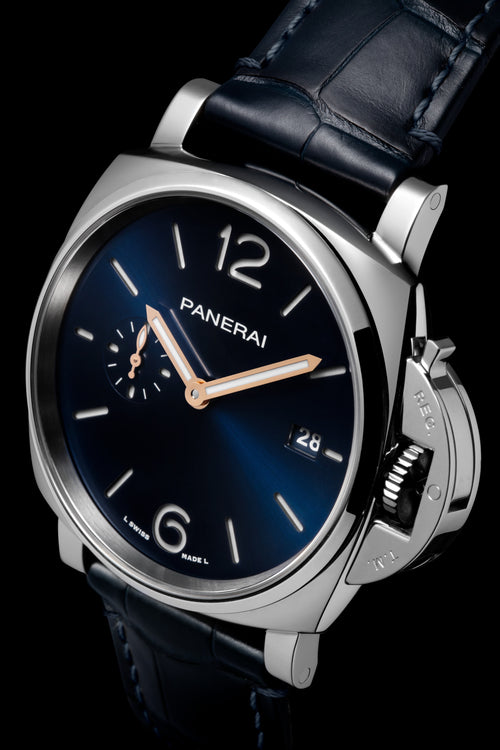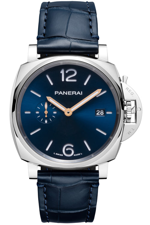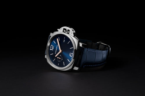 CASE: Polished Steel, Diameter 42MM; MOVEMENT: Automatic mechanical, P.900 Calibre, 72 HRS Power Reserve; DIAL: Blue Dial; STRAP: Alligator Semi-mat Blue; EXTRAS: Small Seconds, Date Display