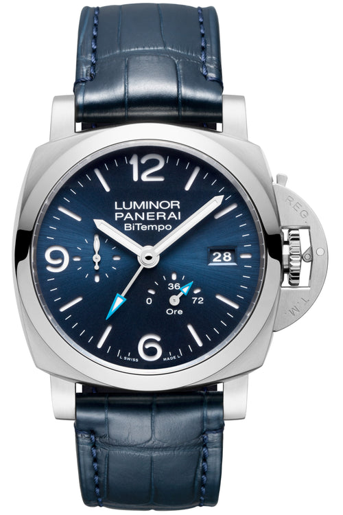 CASE: Brushed Steel, Diameter 44MM; MOVEMENT: Automatic Mechanical P.9012 72 HRS Power Reserve; DIAL: Blue Dial; STRAP: Alligator Semi-mat Blue; EXTRAS: Small Seconds, Date Display, Time Zone, Power Reserve, Stop Seconds Device