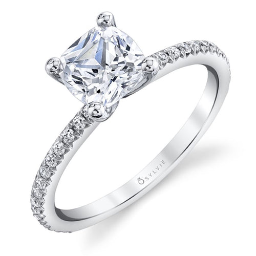 14K White Gold with 1.50 CT Cushion Cut Head, 4-Prong, and Diamond Shoulders=0.21 CTTW