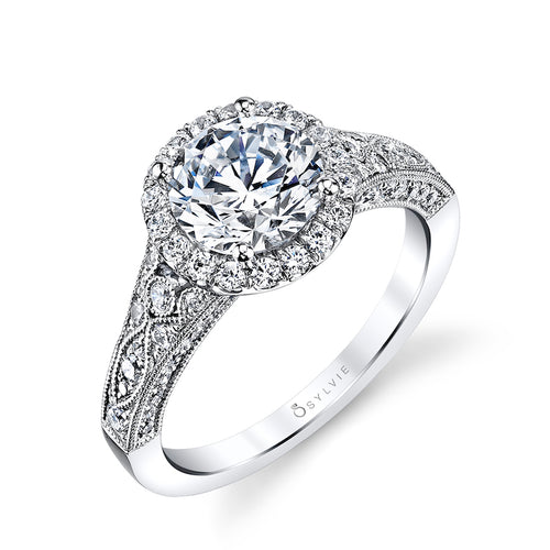 14K White Gold with Diamonds=0.76 CTTW with Halo and Varied Size Diamonds Finished with Milgrain, for a 1.00 CT Brilliant Round Center