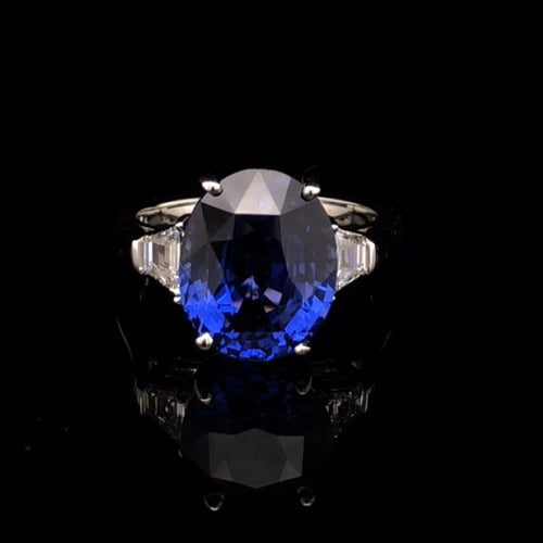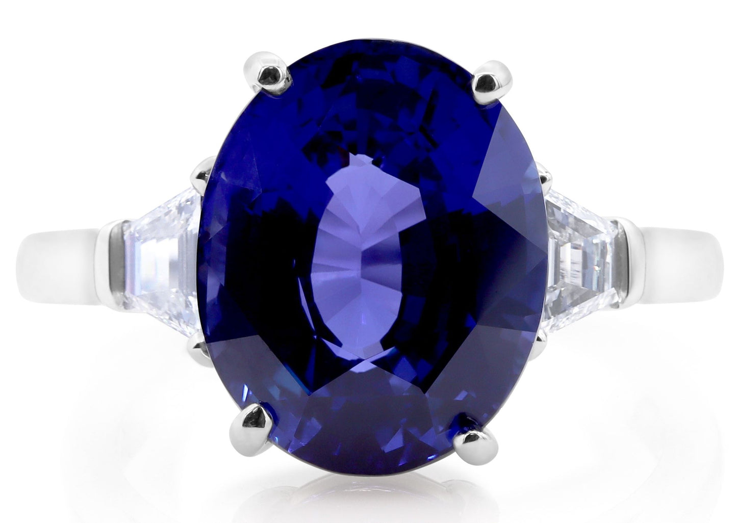 Platinum with One Oval Cut Color Change Sapphire=7.52 CTS, Certified #CDC 2205668, Sri Lanka Origin, with Two GIA Certified Trapezoid Cut Diamonds=0.61 CTTW, #1397531451 & #7396531980, F Color, VVS Clarity, Size 6.5