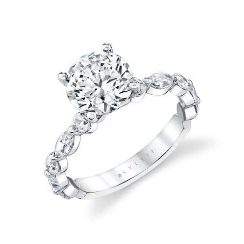 14K White Gold for a 2 CT Brilliant Round Center, 4-Prong, with Marquise and Brilliant Round Diamond Shoulders, 10 Diamonds=0.72 CTTW, Six are Marquise, Four are Round, Shared Prong Set