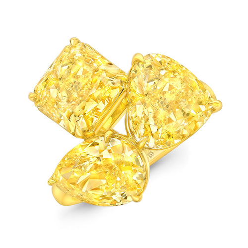 18K Yellow Gold with GIA Certified Fancy Yellow Diamonds: 1-3.62 CT Radiant Cut Fancy Yellow, VS-1 Clarity, GIA #7413061287, 2-3.01 CT Pear Shape, Fancy Yellow, SI-1 Clarity, GIA #2211841383, 3-3.53 CT Heart Shape, Fancy Yellow, VVS-2 Clarity, GIA #2223358360, Diamond Carat Total Weigh=10.16 CTTW, Size 6.25
