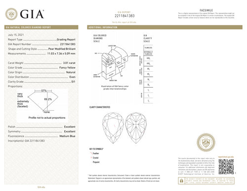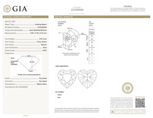 18K Yellow Gold with GIA Certified Fancy Yellow Diamonds: 1-3.62 CT Radiant Cut Fancy Yellow, VS-1 Clarity, GIA #7413061287, 2-3.01 CT Pear Shape, Fancy Yellow, SI-1 Clarity, GIA #2211841383, 3-3.53 CT Heart Shape, Fancy Yellow, VVS-2 Clarity, GIA...