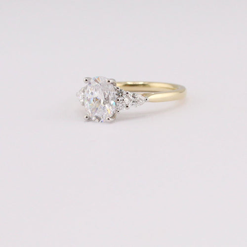 14K Yellow and White Gold with 2 CT Oval Cut Center Head and Two Brilliant Round Cut and One Pear Cut Diamond on Each Side, 6 Diamonds=0.37 CTTW, Size 6.5
