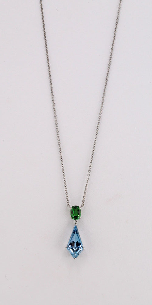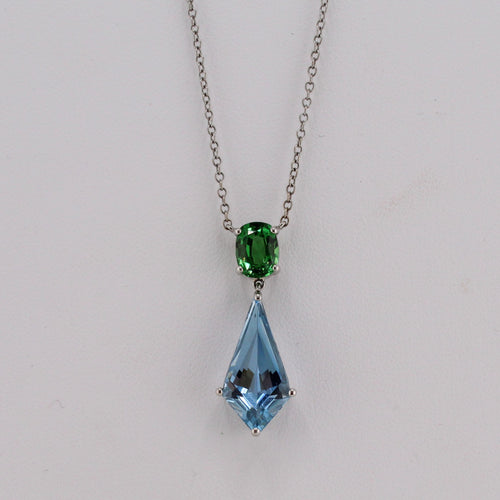 Platinum with One Kite Cut Aquamarine=2.97 CTS and One Oval Cut Tsavorite Garnet=1.13 CTS, Pendant Drop Length=1 1/16", on a Fixed 18K White Gold Chain, Chain Length=15.5"
