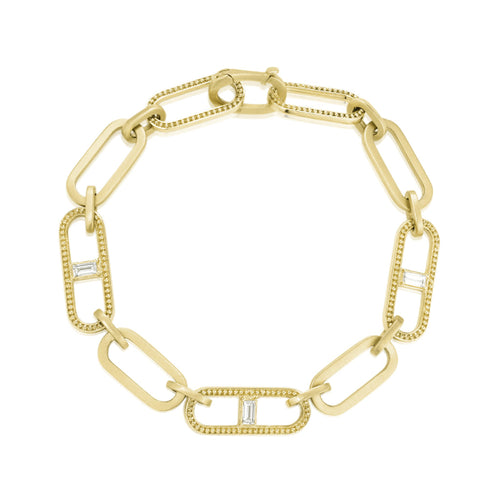 18K Yellow Gold with Three Baguette Diamonds=0.36 CTTW, Beaded and Polished Finish, Length=7"