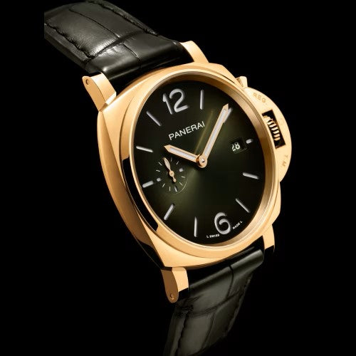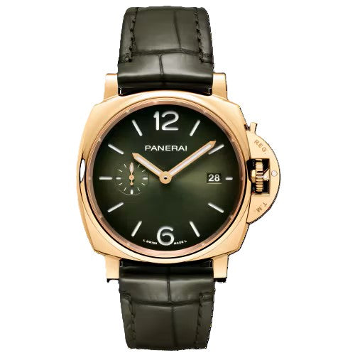 CASE: 42MM, 18K Yellow Gold; MOVEMENT: Automatic Mechanical, P.900 Calibre, Power Reserve=72 Hours; DIAL: Green Sun-brushed; STRAP: Dark Green Alligator; EXTRAS: Hours, Calendar Aperture , Small Seconds , Minutes