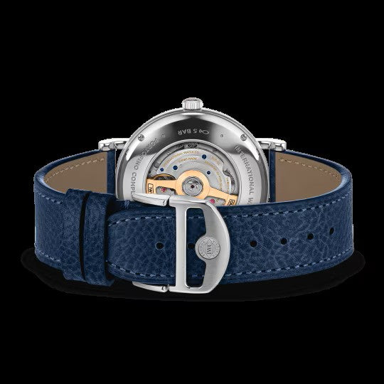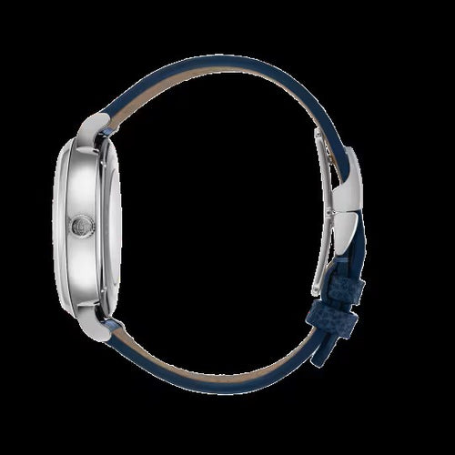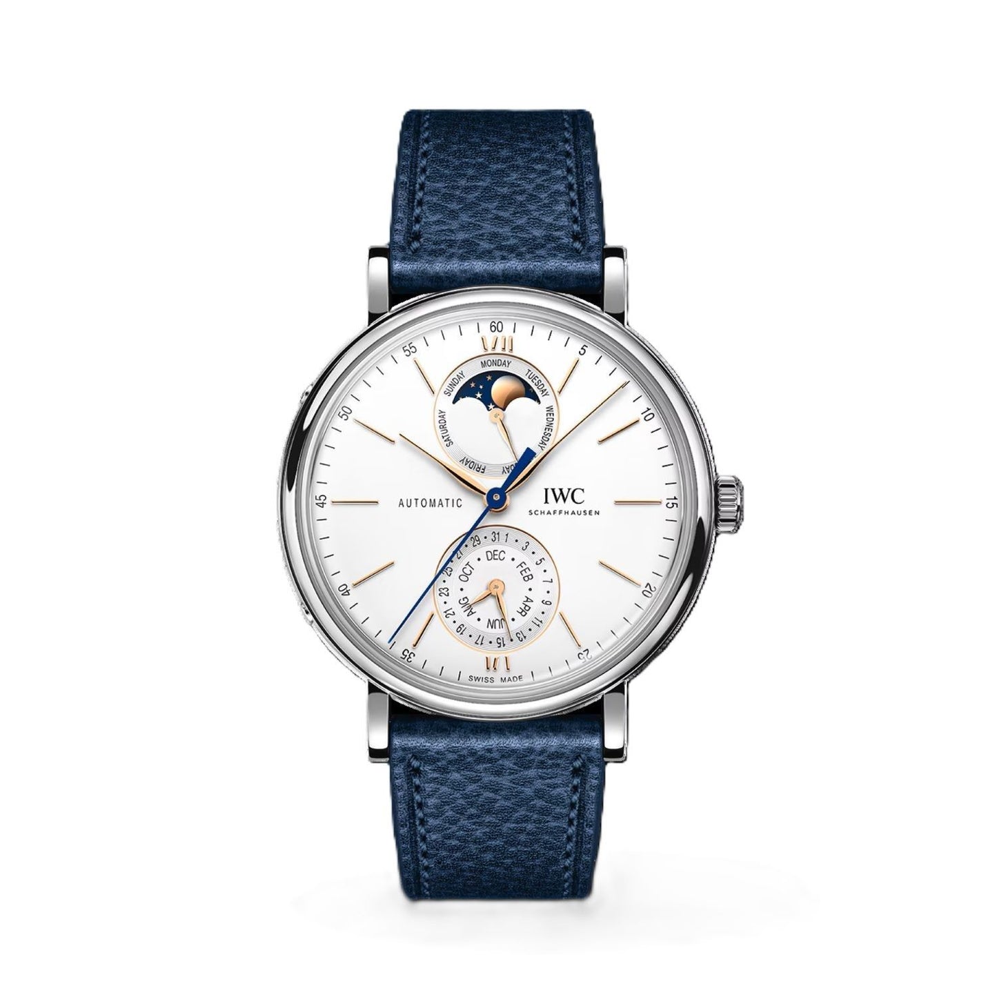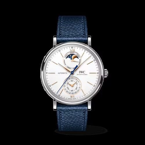 Case: Stainless steel case, Diameter 41MM; Movement: 32150 Calibre, Automatic, self-winding, 72 hours Power Reserve; Dial: Silver dial, Moon phase display; Strap: Blue calfskin strap; Extras: Portofino Complete Calendar
