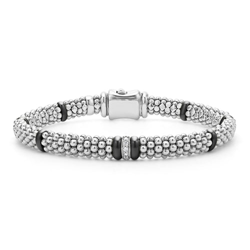 Sterling Silver with Black Ceramic and Diamonds=0.05 CTTW, G-H Color, SI Clarity, Width=6 MM, One Presser Clasp, Size Medium