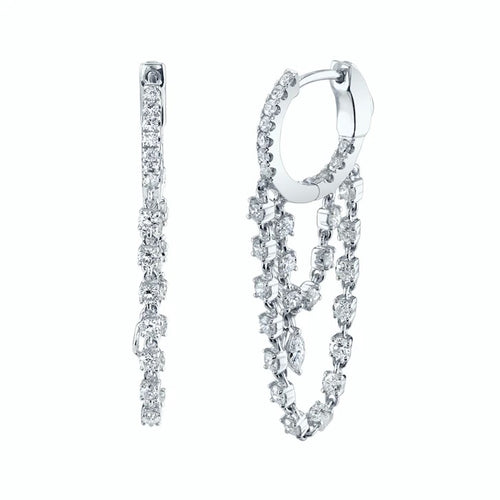 18K White Gold Sophia Double Chain Huggie and Dangle Earrings, Round Diamonds=1.40TW and Marquis Diamonds=.09TW
