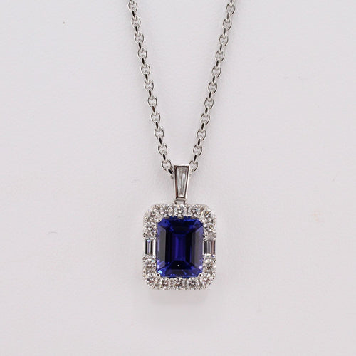 18K White Gold with Step Cut Tanzanite=2.87 CT and 17 Diamonds, Brilliant Round and Baguettes=0.73 CTTW, with Tapered Baguette Bail, 16" Chain