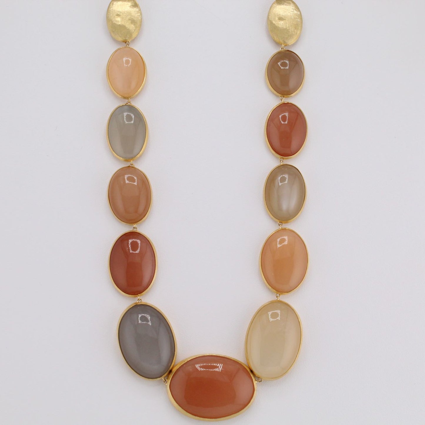 18K Yellow Goldwith Ten Bezel Set Cabochon Cut Moonstone=286.32 CTS, Finished with the Florentine Technique, Necklace Length=17.75"